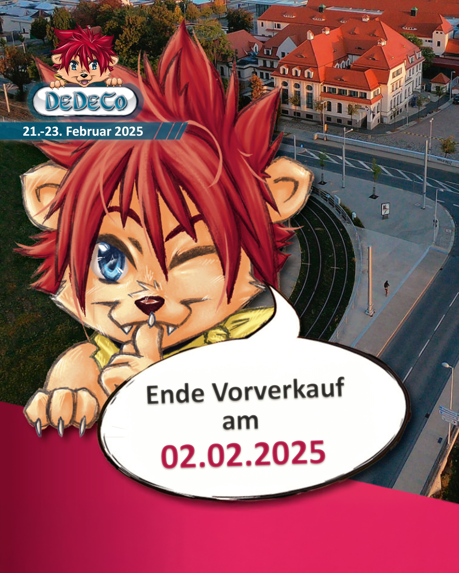 Ihr wollt schnell auf die Con und nicht erst lange in der Schlange stehen? Dann sichert euch noch schnell ein Ticket für die DeDeCo, denn der Vorverkauf endet bereits am 02.02.2025! Also schnell zum Ticketshop und holt euch euer Vorverkaufsticket für die Con!