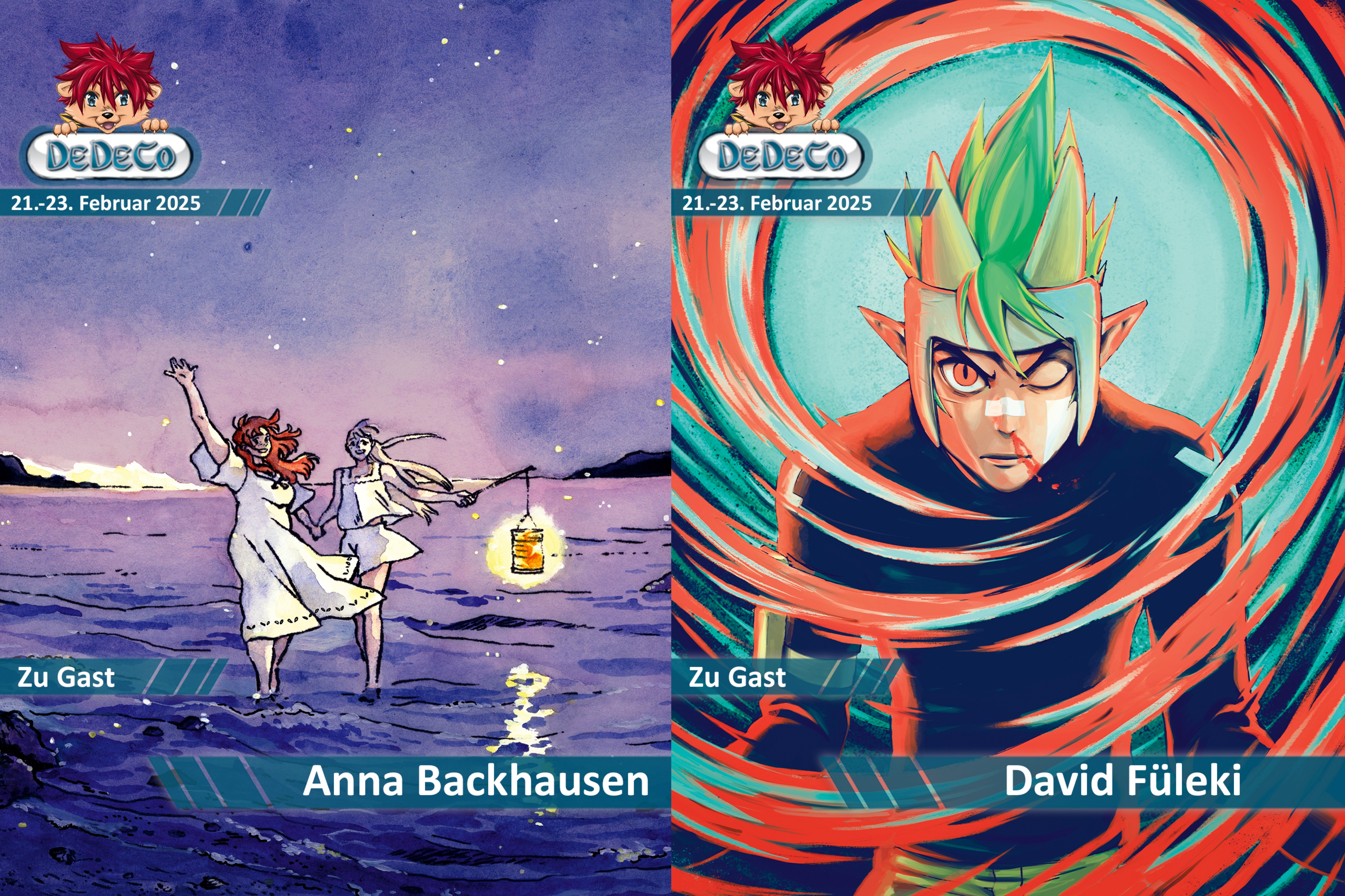 Wir freuen uns, euch unsere diesjährigen Mangaka-Ehrengäste ankündigen zu dürfen! Heißt gemeinsam mit uns David Füleki und Anna Backhausen auf der DeDeCo 2025 willkommen. Ihr werdet beide nicht nur zu sehen, sondern auch zu hören bekommen, denn sie haben ein gemeinsames Panel "Deutsche Mangaka - geht das?" auf der Kleinen Bühne von 12-13 Uhr!