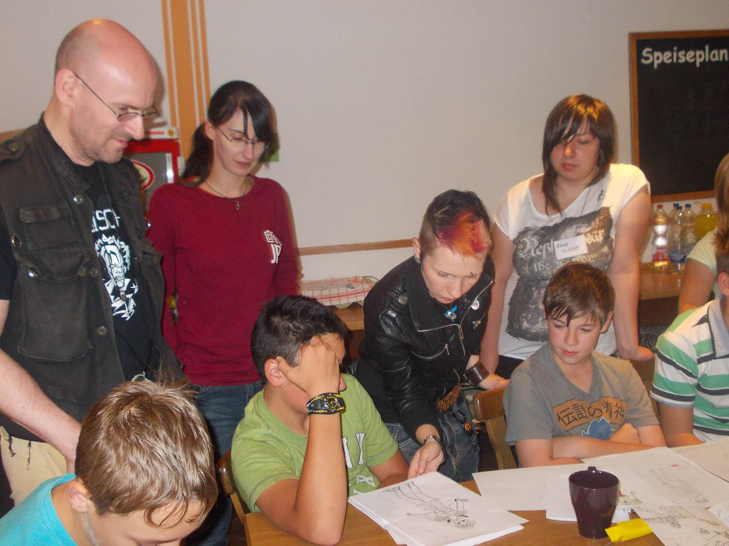Am nächsten Tag ging es dann endlich selber ans Zeichnen. Sonja und Tanja vom DeDeCo e.V. erklärten zusammen mit Guido Neukamm den Kindern das ganze A-Z des Manga-Zeichnens. Von Anatomie, über das korrekte Zeichnen von Händen und Füßen bis hin zur Panel-Einteilung.